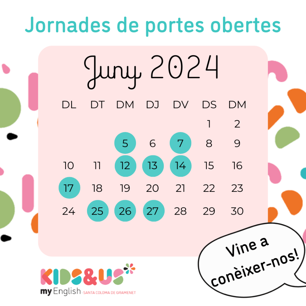 Durant aquest mes de juny, et proposem venir a visitar-nos a les nostres jornades de portes obertes perquè gaudeixis del nostre mètode. T’esperem a Kids&Us Santa Coloma de Gramenet (C/ Irlanda, 38-40).